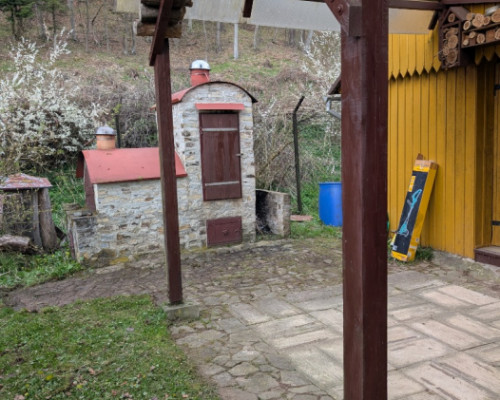 Na działce domek drewniany, stan raczej do remontu, w środku jest wyposażony w stół, leżankę, krzesła, generalnie bez wygód. Jest prąd, woda w potoku za działką w lesie. Przy domku jest też beczka i osobny pojemnik na wodę ok 200 litrów.